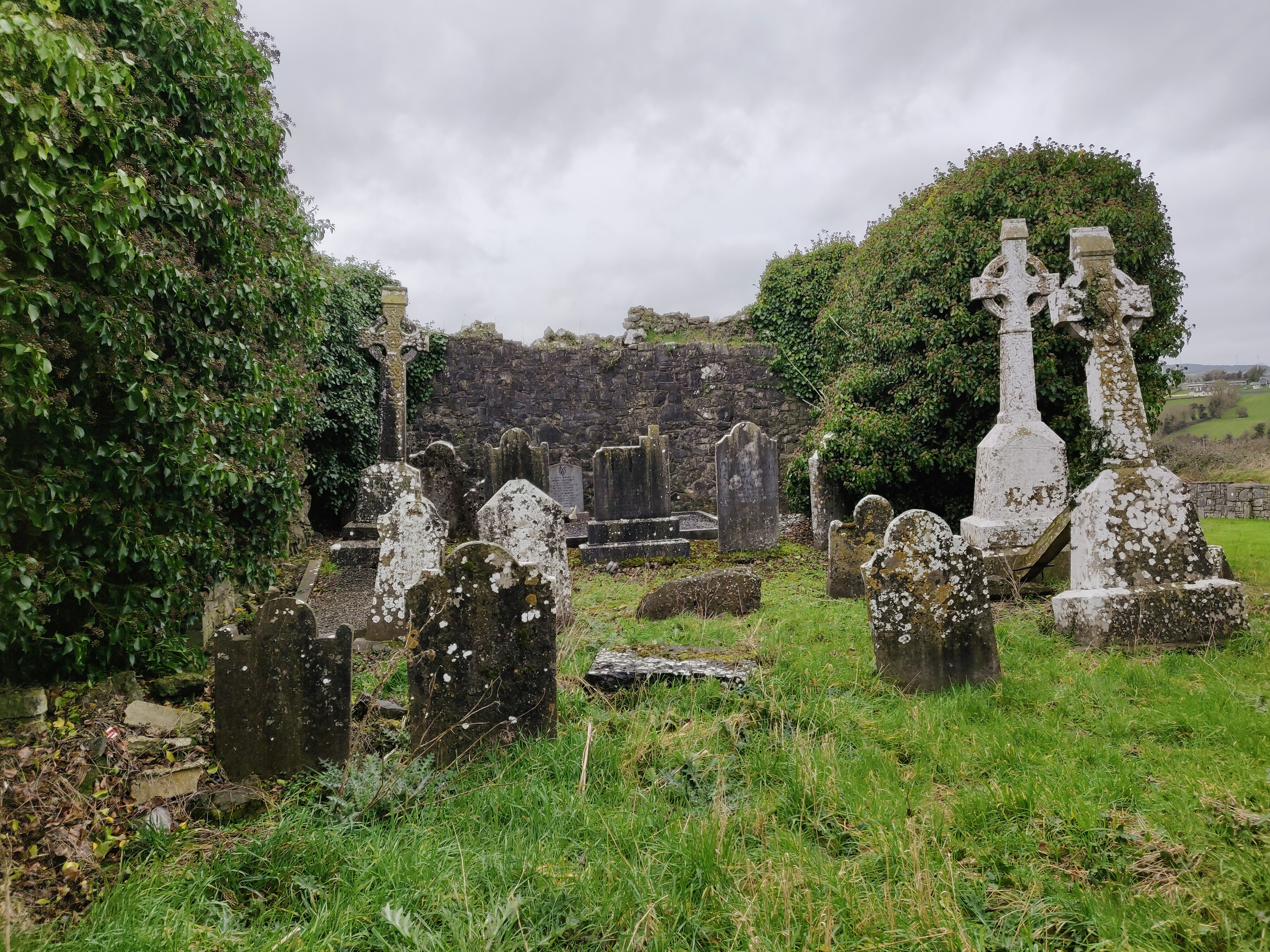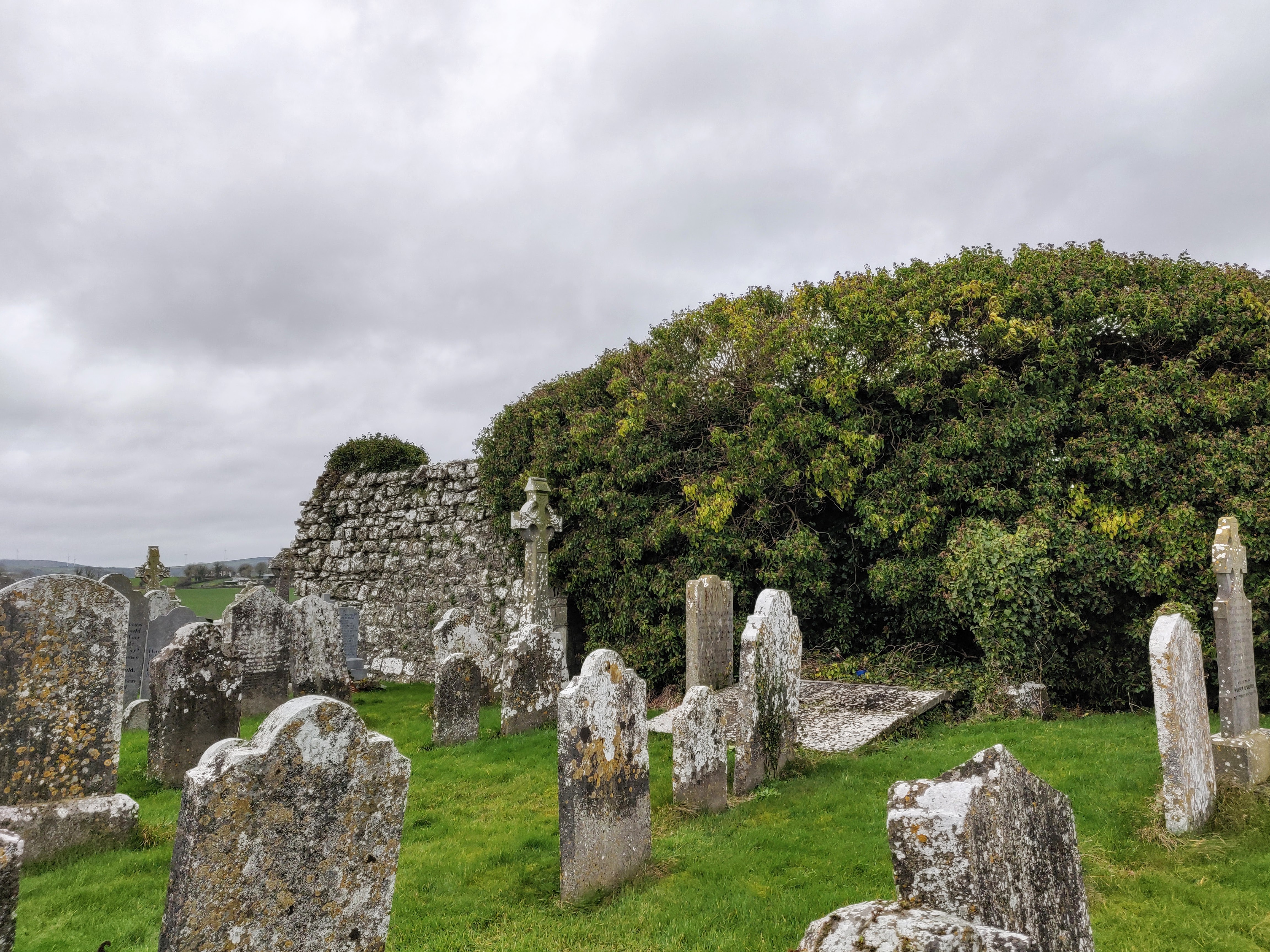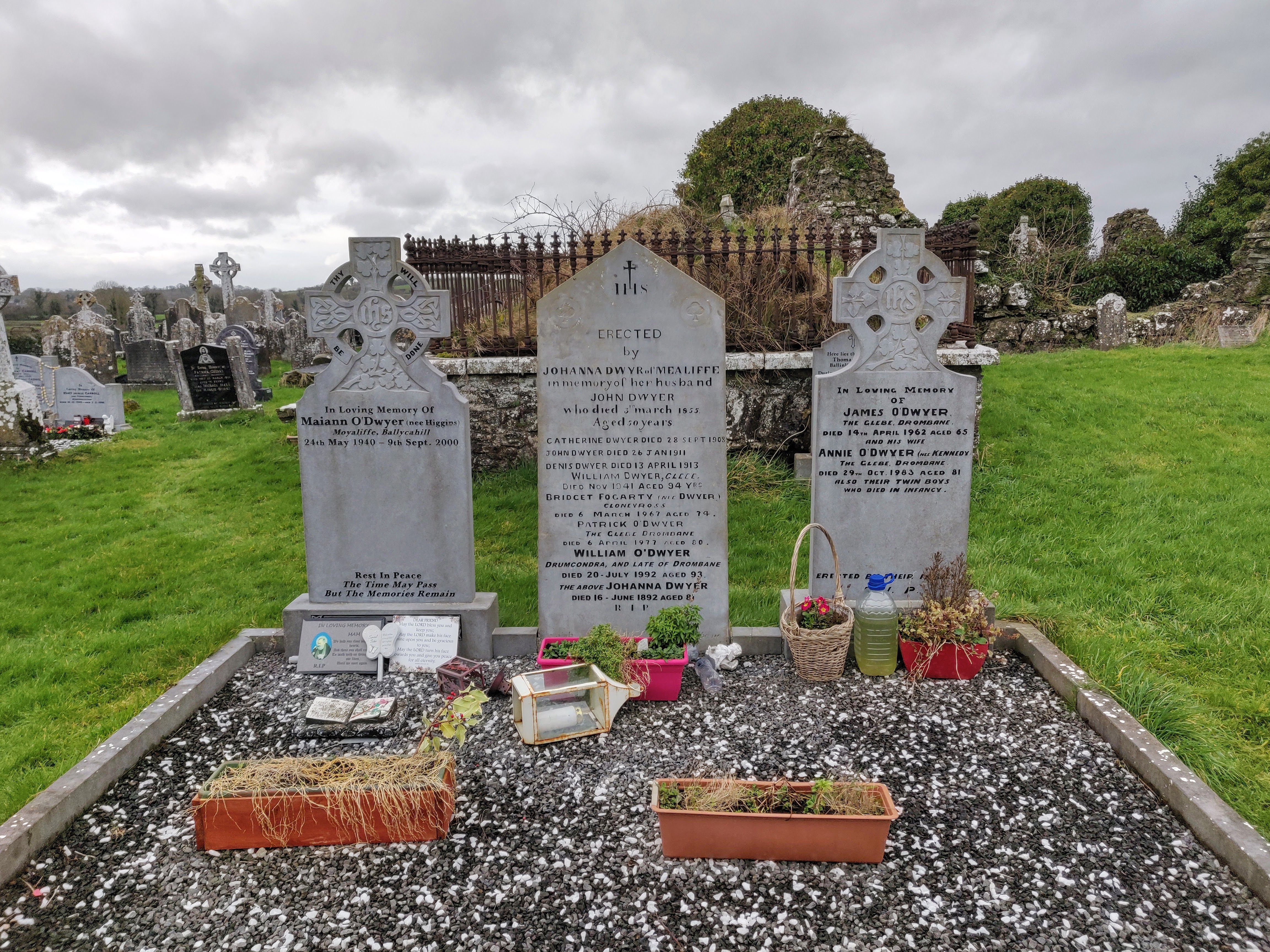 Another ruin. There’s another possible castle on the hill opposite and a church yard with some Dwyers in it: